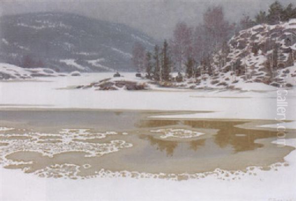 Gustaf Fjaestad's Blidvader - Vinterlandskap Med Vattendrag (1899) is a mesmerizing ode to Sweden’s frost-laden beauty, epitomizing the National Romanticism movement. The painting captures a snow-clad stream winding through dense evergreen woods, where delicate ice crystals cling to branches and sunlight filters through in muted silver tones. Fjaestad’s meticulous brushwork renders each frozen ripple and pine needle with near-scientific precision, yet the scene exudes serenity—a harmony between nature’s quiet resilience and winter’s ephemeral grace. As a pioneer of "snow romanticism," Fjaestad elevated Scandinavian winter landscapes into symbols of national identity, bridging 19th-century realism and Art Nouveau’s decorative elegance. Today, this masterpiece remains iconic for its poetic realism and technical mastery, often likened to Monet’s Ice Floes but steeped in Nordic mystique.