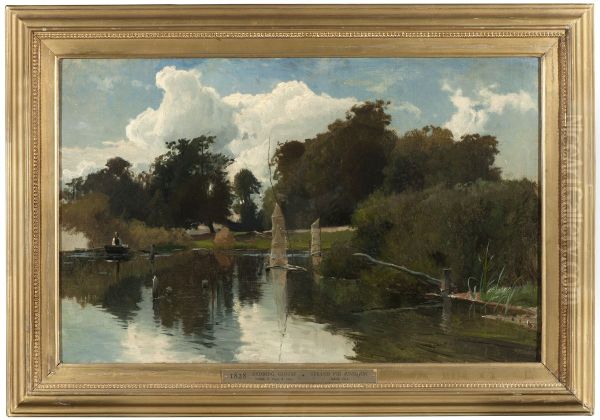 Gustaf Rydberg’s The Shore of Ringsjon I is a captivating example of late 19th-century Scandinavian landscape painting, exuding a serene yet melancholic atmosphere. The work depicts the tranquil shores of Lake Ringsjön in southern Sweden, where soft, diffused light bathes the scene in a dreamlike haze. Rydberg, influenced by the Romantic tradition, masterfully blends realism with poetic sensibility, capturing the quiet beauty of nature with delicate brushwork and a muted, earthy palette. The composition—with its reflective water, sparse vegetation, and vast, open sky—evokes a sense of solitude and introspection, characteristic of the Nordic spirit. Though lesser-known internationally, Rydberg holds a significant place in Swedish art history as a bridge between Romanticism and early modernism, and this painting exemplifies his ability to infuse landscapes with emotional depth.