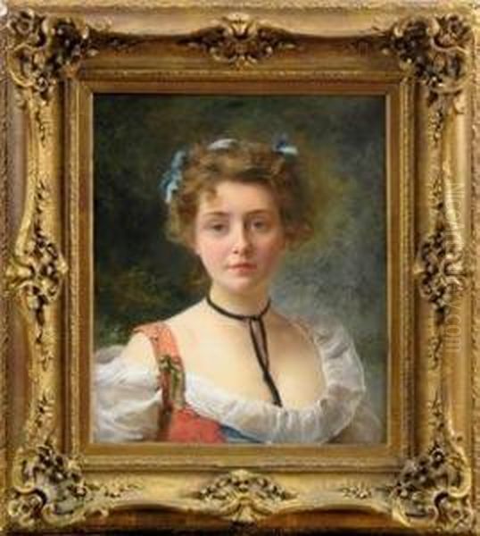 In Gustave Jacquet's Portrait de Jeune Femme au Ruban Bleu, elegance and intimacy intertwine through the artist’s meticulous brushwork. The painting, created in the late 19th century, captures a young woman adorned with a delicate blue ribbon, her gaze serene yet evocative. Jacquet, a French academic painter known for his refined portraiture, imbues the work with a soft luminosity and exquisite attention to textile details—traits reminiscent of Renaissance influences merged with the precision of salon-style art. The blue ribbon serves as both a focal point and a symbol of restrained sophistication, contrasting subtly with the warm, muted tones of the background. Though less widely celebrated than his contemporaries, Jacquet’s work exemplifies the enduring appeal of classical beauty in an era increasingly dominated by Impressionist experimentation, making this piece a quiet yet significant gem in art history.