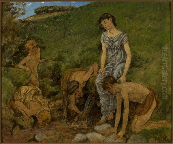 Hans Thoma's At the Spring Well (German: Am Brunnen im Frühling) is a poetic 19th-century masterpiece that transports viewers to a serene moment in rural Germany. Painted in 1874, this idyllic scene depicts a young woman drawing water from a stone well amidst lush greenery, with dappled sunlight filtering through the trees. Thoma's distinctive style blends Biedermeier intimacy with plein-air naturalism, his delicate brushwork capturing the play of light on fabric and foliage with near-Pre-Raphaelite attention to detail. Historically significant as part of Germany's late Romantic Heimatkunst movement, the work reflects Thoma's deep connection to his Black Forest homeland. The painting's harmonious balance between human presence and nature established Thoma as a bridge between traditional Germanic art and emerging Impressionist sensibilities, making it a fascinating transitional piece in European art history.