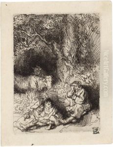 Half Length Figure Of Rembrandt In A Feathered Cap, His Eyes Cast In Shadow.