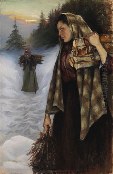 In Wood Gatherers (c. 1900), Finnish artist Helmi Biese masterfully captures a serene yet poignant moment of rural life. The painting, imbued with the soft luminosity of Nordic light, depicts peasant women gathering firewood in a tranquil, snow-dappled forest—a recurring theme in Biese’s oeuvre. Her delicate brushwork and muted palette, typical of the Romantic-nationalist tradition, evoke both the quiet dignity of labor and an intimate connection with nature. Trained under Albert Edelfelt, Biese infused her work with lyrical realism, bridging 19th-century academicism and early modernism. Though less renowned than her male contemporaries, her contributions to Finnish plein air painting and nuanced portrayals of women’s labor hold a distinctive place in Nordic art history. The painting’s atmospheric depth and emotional restraint resonate with the era’s growing appreciation for regional identity and everyday lyricism.