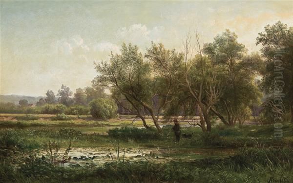 The Fisherman by Hendrik D. Kruseman Van Elten is a serene yet evocative 19th-century Dutch painting that captures the quiet dignity of rural life. Set against a softly lit landscape, the lone fisherman, draped in humble attire, becomes a poetic symbol of resilience and harmony with nature. Van Elten, a prominent figure of the Hague School, masterfully blends realism with atmospheric subtlety, using muted earth tones and delicate brushwork to evoke a timeless, almost meditative quality. This work exemplifies the Dutch Romantic tradition, where human figures are framed by expansive skies and tranquil waters, reflecting the era's fascination with pastoral idealism. Though less widely known than his peers, Van Elten’s contribution to European genre painting lies in his ability to infuse everyday scenes with quiet emotional depth, making The Fisherman a valuable piece for collectors of 19th-century European art.