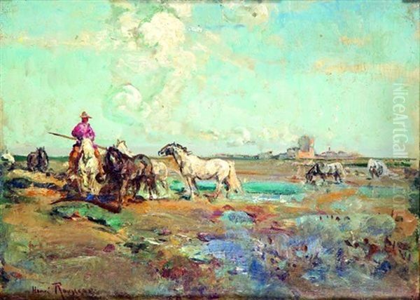 Henri Emilien Rousseau’s Paysage De Camargue transports viewers to the sun-drenched marshes of southern France, where golden light bathes the tranquil waterways and grazing white horses. The painting exudes a serene yet vibrant energy, blending Rousseau’s signature romantic realism with subtle Impressionist influences. Its loose brushwork and luminous palette capture the ephemeral beauty of the Camargue region, celebrated for its wild landscapes and unique cultural heritage. Created in the late 19th or early 20th century, this work reflects Rousseau’s mastery of evocative landscapes and his role in bridging academic traditions with modern sensibilities. Though less famous than his namesake Henri Rousseau (Le Douanier), Henri Emilien Rousseau’s works are prized for their poetic elegance and contribute to the legacy of French regionalist painting. Paysage De Camargue stands as a testament to the artist’s ability to infuse nature with quiet grandeur.