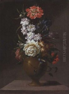 Henriette Gertruide Knip's Blumenstilleben Mit Iris Und Nelken (Still Life with Irises and Carnations) is a vibrant celebration of botanical beauty, showcasing the Dutch Golden Age's meticulous attention to floral detail. Painted in the early 19th century, this work reflects both the enduring legacy of Dutch still-life traditions and Knip's unique sensitivity to light and texture. The composition features a lush bouquet of irises and carnations, their petals rendered with delicate precision against a dark, muted background—a hallmark of the genre that emphasizes contrast and depth. Knip, though less renowned than her male contemporaries, contributed significantly to floral still-life painting during a period when female artists were gaining recognition. The painting exemplifies Romantic-era floral art, balancing botanical accuracy with an almost poetic softness. Today, it serves as a testament to the underappreciated role of women in art history, offering a bridge between 17th-century Dutch realism and 19th-century romantic naturalism.