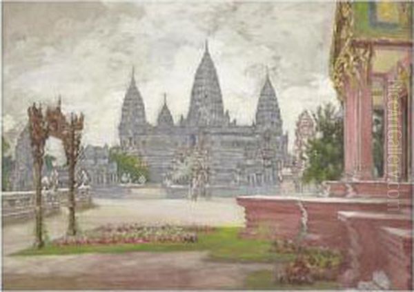 Henry D'Estienne's Temple Au Cambodge transports viewers to an atmospheric portrayal of Cambodian architectural grandeur. Rendered with delicate brushwork characteristic of early 20th-century French Orientalism, the painting captures sunlit stone carvings and verdant foliage enveloping an ancient temple, evoking serenity and exotic intrigue. Estienne, deeply influenced by his travels across colonial Indochina, masterfully blends European academic precision with romanticized Eastern motifs—bridging ethnographic documentation and poetic idealism. This work reflects the Western fascination with Asia’s "mystical East" prevalent among artists like Matisse and Delacroix, yet stands apart for its subdued palette and reverence for sacred geometry. Today, it offers historical insight into cross-cultural encounters while remaining prized for its meditative elegance within Southeast Asian-themed collections.