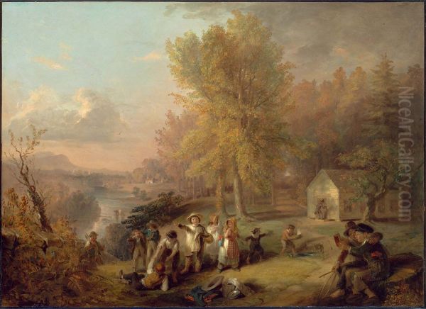 Henry Inman’s Dismissal of School on an October Afternoon (c. 1845) captures a nostalgic, golden-hued scene of antebellum American childhood, radiating warmth and simplicity. The painting depicts a rural schoolhouse bathed in soft afternoon light, where children spill out onto the grassy yard—some laughing, others lingering—while a lone teacher watches from the doorway. Inman, a prominent portraitist and genre painter of the Hudson River School era, blends meticulous detail with atmospheric luminosity, evoking a sense of tranquility and fleeting innocence. This work stands as a treasured example of 19th-century American genre painting, bridging the romanticism of earlier traditions with the emerging realism of everyday life. Its historical significance lies in its tender portrayal of education and community, reflecting the era's ideals while quietly foreshadowing the societal shifts ahead.