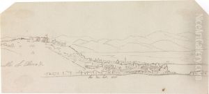 Landscape View of a Ruined Castle with River, Wooden Bridge and a Figure, Fishing