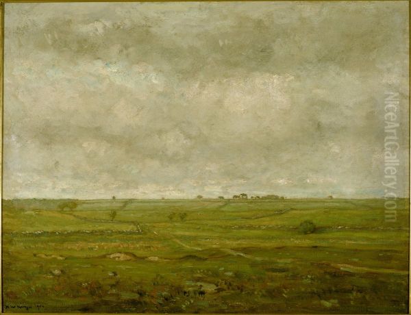 Henry Ward Ranger’s Landscape exemplifies the tonalist style he helped pioneer in late 19th-century American art. The painting envelops viewers in a moody, atmospheric scene where soft, diffused light bathes rolling hills, dense foliage, and perhaps a tranquil body of water—hallmarks of Ranger’s affinity for harmonious, muted naturalism. His technique, influenced by the Barbizon School, favors subdued earth tones and delicate gradations of light, evoking a sense of quiet introspection. As a central figure in the Old Lyme Art Colony, Ranger played a key role in bridging European tonalism with American landscape painting, making this work historically significant for its contribution to the movement’s stateside evolution. The piece invites contemplation, blending realism with poetic ambiguity—a signature of his legacy.