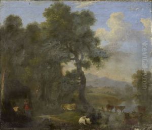 Italianate Landscape With Figures Cattle And Sheep Crossing A Dam