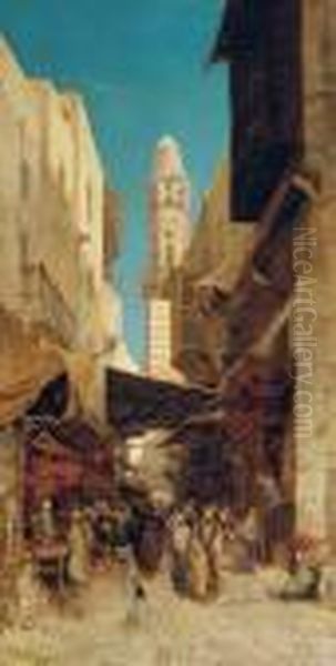 The bustling energy of Cairo’s markets comes alive in Hermann David Solomon Corrodi’s A Market In Cairo, a captivating 19th-century Orientalist masterpiece. Corrodi, known for his evocative travel scenes, immerses viewers in a vibrant tableau of merchants, locals, and wandering travelers beneath the golden glow of the Middle Eastern sun. Rich earth tones contrast with vivid splashes of color—spices piled high, patterned textiles, and the play of light on weathered stone architecture—creating a scene both exotic and intimate. The painting reflects European fascination with the "Orient" prevalent during the era, blending academic precision with romanticized flair. Though not as renowned as some Orientalist contemporaries, Corrodi’s work holds historical significance for its documentary charm and atmospheric storytelling, offering a window into Western perceptions of North African culture during the colonial period.