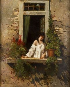 Lady On A Balcony by Hermann David Solomon Corrodi (1844–1905) transports viewers to a serene Mediterranean reverie, where warm sunlight bathes a stately stone balcony overlooking azure waters. This late 19th-century Orientalist masterpiece exemplifies Corrodi’s signature blend of Academic precision and Romantic ambiance, capturing lush architectural details and the quiet elegance of its solitary female figure draped in flowing fabrics. As a member of the prominent Corrodi artist family specializing in European-Ottoman scenes, Hermann’s work reflects the era’s fascination with exoticism while maintaining classical compositional harmony. Historically significant within Orientalist painting, it bridges documentary detail with poetic idealization—a coveted attribute among Gilded Age collectors. Today, its atmospheric luminosity and tranquil grandeur continue to resonate as prime examples of Victorian-era travel-inspired art.