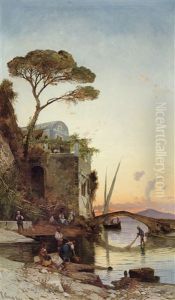 Hermann David Solomon Corrodi's Petit Port De Peche Dans La Baie De Naples captures the serene charm of Naples' coastline with luminous realism. Painted in the late 19th century, Corrodi’s work blends Romanticism’s emotional depth with the precision of Orientalist details, reflecting his travels across the Mediterranean. Sunlight dances on tranquil waters, casting golden reflections on fisherboats and weathered stone quays, while distant hills soften into hazy blues—an idyllic yet fleeting moment preserved on canvas. As a key figure of the Victorian Grand Tour era, Corrodi catered to European aristocracy’s taste for exotic landscapes. This piece exemplifies his mastery in balancing topographical accuracy with poetic atmosphere, cementing his legacy as a bridge between documentary precision and picturesque allure. Its historical value lies in romanticizing Naples’ bustling maritime life, offering a nostalgic portal to 19th-century travel narratives.
