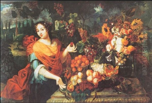 Jonge vrouw bij een tafel, versierd met bloemen en fruit