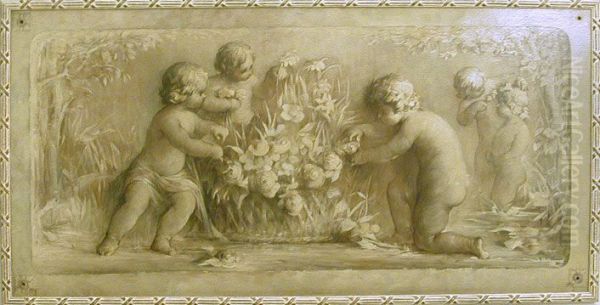 Putti playing with flowers near a pond