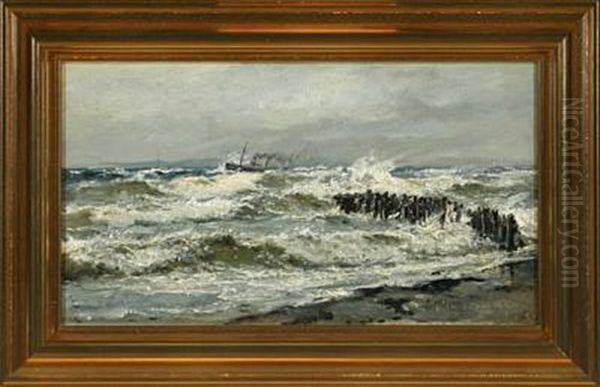 Holger Drachmann’s Coastal Scenery With Steamer is a captivating maritime masterpiece that breathes life into the raw beauty of the sea and sky. Painted during the late 19th century—a period of Romantic-Nationalist fervor in Scandinavian art—the work embodies Drachmann’s dual talent as both a poet and painter. With brisk, expressive brushstrokes typical of the Skagen Painters’ realism-meets-impressionism style, the piece juxtaposes the serene expanse of coastal waters against the industrious presence of a steamer, symbolizing modernity’s intrusion into nature’s timeless rhythm. Its historical significance lies in Drachmann’s role as a cultural bridge between Denmark’s Golden Age and the avant-garde movements that followed, making this painting a subtle yet profound commentary on transition and human-nature dynamics.