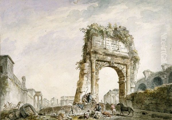 Hubert Robert's "Arch of Titus in Rome" is a captivating 18th-century oil painting that masterfully blends romantic grandeur with archaeological precision. Known as "Robert des Ruines" for his ruin paintings, the artist depicts Rome's iconic 1st-century triumphal arch bathed in golden twilight, its weathered stone glowing against a dramatic sky. Painted during Robert's transformative 11-year stay in Italy (1754-1765), the work exemplifies his signature "capriccio" style - imaginatively rearranging classical elements while maintaining topographic accuracy. The composition balances the arch's solemn monumentality with lively human vignettes: travelers resting in its shadow, workers moving through the foreground. Atmospheric perspective softens distant buildings, creating depth while emphasizing the arch's enduring presence. This painting represents a crucial bridge between Piranesi's architectural exactitude and the emerging Romantic movement's emotional landscapes, making it significant in studies of Neoclassical-Romantic transition.
