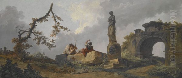 Standing as a poetic testament to 18th-century romanticism, The Statue by Hubert Robert (1733–1808) transports viewers into a dreamlike realm where nature reclaims human grandeur. The painting, likely created during Robert’s mature period (1770s–1780s), depicts a crumbling classical statue enveloped by lush vegetation, its weathered marble contrasting with the vibrant foliage—a hallmark of his capriccio style, blending real and imagined architecture. Known as "Robert des Ruines" for his mastery of ruin paintings, the artist infuses this work with melancholic beauty, echoing Enlightenment-era fascination with transience and the sublime. Its composition—play of light filtering through leaves, textured brushwork, and harmonious decay—cements Robert’s legacy as a bridge between Rococo charm and emerging Romanticism, influencing later artists like Piranesi.