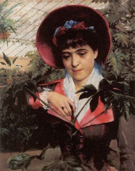 Hugo Birger's Kunstnerens Hustru Mathilde Gadea I Vinterhaven (The Artist's Wife Mathilde Gadea in the Winter Garden) is a luminous portrayal of domestic tranquility and natural beauty. Painted in 1883, this work exemplifies Birger's mastery of light and texture, capturing his wife seated amidst lush greenery in a winter garden—a popular theme among 19th-century Scandinavian artists. The soft, diffused light filtering through the glass panes bathes the scene in warmth, contrasting with the cool tones of the outdoors. Birger, a prominent figure in Swedish Realism, blends meticulous detail with an almost Impressionistic sensitivity to atmosphere, bridging academic precision and modern spontaneity. The painting stands as a testament to the era's fascination with indoor gardens as symbols of refinement and harmony with nature. Its historical significance lies in its intimate yet universal appeal, offering a glimpse into bourgeois life while showcasing Birger's role in advancing Scandinavian art beyond traditional genres.