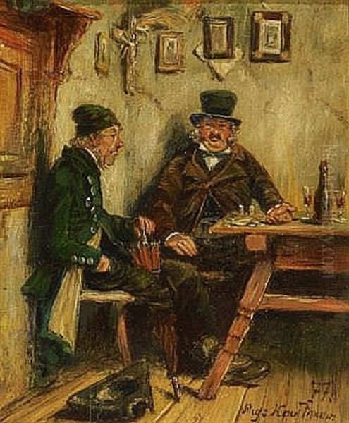 For integrating Der Handel into a space, its rustic warmth lends itself to traditional or transitional interiors—think wood-paneled studies, cozy libraries, or restaurants with vintage charm. The earthy tones of ochre, brown, and muted reds in the artwork pair beautifully with leather furnishings, dark wood accents, or textured fabrics like wool or linen. Ideal for a medium-sized wall (the original is approximately 80x60 cm), it could serve as a focal point above a console table or fireplace, balanced with simpler décor to avoid visual clutter. In an office, it would inspire conviviality in a meeting area, complemented by brass lighting or warm wall colors like taupe or sage. The painting’s narrative detail invites closer inspection, making it perfect for spaces where conversation and warmth are encouraged.