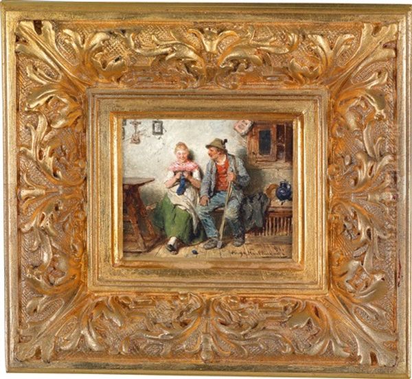 Hugo Kauffmann’s Holzknecht Und Madel is a charming genre painting that vividly captures rural Bavarian life in the late 19th century. Known for his detailed and often humorous depictions of everyday scenes, Kauffmann portrays a woodcutter (Holzknecht) interacting with a young woman (Madel) in a rustic setting, brimming with warmth and character. The painting's muted yet earthy tones, meticulous attention to clothing and facial expressions, and lively composition reflect the artist’s academic realist training—yet his work transcends mere documentation, evoking nostalgia and storytelling akin to the Dutch Golden Age interiors. Unlike grandiose historical paintings of his era, Kauffmann’s focus on ordinary people cemented his reputation as a master of genre painting in Germany, bridging folkloric tradition with fine art. This piece exemplifies his ability to infuse humor and humanity into domestic and laborious themes, making it a treasured example of regional realism.