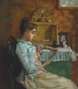 Irving Ramsay Wiles' Woman in Her Dressing Room (1899) captures an intimate moment of bourgeois femininity in the Gilded Age, where soft light spills across the composition like liquid gold. The subject—an elegant woman adjusting her evening gloves—is framed by sumptuous furnishings, her reflection lingering ambiguously in the dressing mirror. Wiles’ brushwork blends the precise detailing of academic portraiture with the loose, luminous handling of American Impressionism, bridging 19th-century tradition and modern subjectivity. The painting’s restrained palette of ivory, rose, and gilt embodies Aesthetic Movement sensibilities, celebrating beauty as an autonomous ideal. Historically significant, it reflects the era’s fascination with private female rituals while resisting overt narrative—a hallmark of Wiles’ psychologically nuanced oeuvre that positioned him among John Singer Sargent’s esteemed contemporaries.