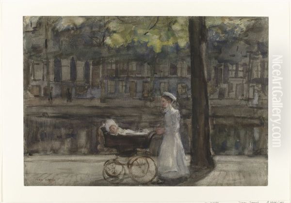 The painting Dienstmeisje met kinderwagen (1905–1910) by Isaac Lazarus Israels captures an intimate yet fleeting moment of urban life in early 20th-century Amsterdam. A young nursemaid, clad in a modest blue dress, casually leans against a baby carriage while gazing into the distance. Israels’ loose, expressive brushwork—characteristic of the Amsterdam Impressionism movement—infuses the scene with vitality and spontaneity. The soft play of light and shadow, along with the subdued yet harmonious palette, evokes a sense of quiet realism, celebrating the beauty in everyday simplicity. As a key figure in Dutch Impressionism, Israels was influenced by the likes of Manet and Degas, yet his focus on working-class subjects and candid urban vignettes set him apart. This artwork not only reflects the social dynamics of the era but also bridges the gap between traditional Dutch genre painting and modern, impressionistic storytelling.