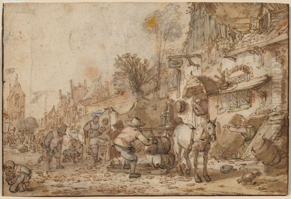 Isaac van Ostade’s Workmen before an Inn (c. 1645) captures a vibrant slice of 17th-century Dutch rural life with warmth and authenticity. The scene unfolds outside a rustic inn, where laborers pause from their toil—some resting, others engaged in lively conversation. Van Ostade’s mastery of light and texture breathes life into the thatched roofs, weathered brickwork, and crumpled clothing, evoking a sense of earthy realism. As a follower of Adriaen van Ostade (his elder brother), Isaac inherited the Haarlem school’s fondness for genre scenes but infused them with a brighter palette and looser brushwork, bridging the gap between Adriaen’s coarse humor and the elegance of later Dutch Golden Age painters. Though less renowned than his brother, Isaac’s works like this are cherished for their dynamic compositions and sympathetic portrayal of peasant life, offering a nuanced counterpoint to the era’s grander historical and portrait traditions.