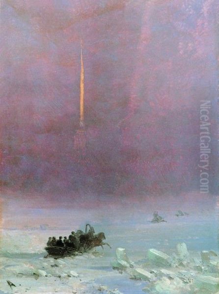 Ivan Aivazovsky’s Petersburg. Pereprava cerez Nevu. (St. Petersburg: Crossing the Neva) captures the grandeur and dynamism of Russia’s imperial capital in the 19th century. Known for his mastery of seascapes and luminous skies, Aivazovsky shifts focus here to the Neva River, where boats and figures bustle under a vast, atmospheric sky. The painting radiates a sense of movement and life, with delicate brushwork highlighting reflections on the water and the soft glow of twilight. Created during Aivazovsky’s peak, this work exemplifies his Romantic style—melding realism with dramatic light and emotion. Though less famous than his marine storms, it holds significance as a rare urban scene in his oeuvre, offering a glimpse into St. Petersburg’s daily rhythms. Its historical value lies in blending topographical accuracy with artistic idealism, cementing Aivazovsky’s reputation as a chronicler of Russia’s natural and urban beauty.