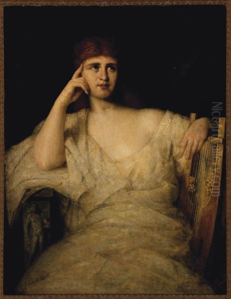 In The Muse of Music (c. 1895), J. Alden Weir captures an ethereal moment steeped in poetic tranquility, blending American Impressionism with a hint of Symbolist mystique. The painting depicts a graceful female figure, possibly Euterpe—the ancient Greek muse of music—lost in serene contemplation, her flowing drapery and delicate posture evoking a lyrical harmony. Weir's loose, luminous brushwork imbues the scene with soft light and atmospheric depth, characteristic of his mature style shaped by French Impressionist influences. As a key figure in the Cos Cob Art Colony and a founding member of "The Ten" American painters, Weir bridged European modernism and American tonalism. This work exemplifies his dual fascination with ethereal subjects and plein-air techniques, occupying a unique niche in late 19th-century art—less overtly decorative than Whistler, yet more introspective than Monet.