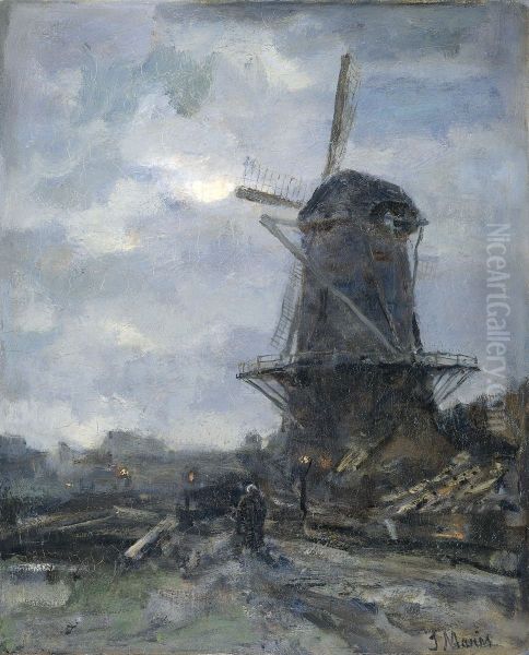 Jacob Maris's Molen bij maanlicht (Windmill by Moonlight) is a captivating example of Dutch Hague School painting, renowned for its atmospheric mood and evocative realism. The scene depicts a solitary windmill bathed in the quiet glow of moonlight, its silhouette softened by the hazy interplay of shadows and silvery light. Maris's loose, expressive brushstrokes and muted tonal palette—dominated by deep blues, grays, and subtle earth tones—create a serene yet melancholic ambiance, characteristic of his mature style. Painted in the late 19th century, the work reflects the Hague School's emphasis on capturing the fleeting effects of light and weather, often infused with a sense of nostalgia for rural Dutch life. Molen bij maanlicht stands as a testament to Maris's mastery in translating emotion into landscape, cementing his status as a pivotal figure in the transition from Romanticism to modern realism in Dutch art.