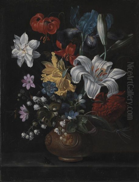 Jacob Marrel's exquisite floral still life En stentojskrukke med blomster immerses viewers in the Baroque splendor of 17th-century Dutch Golden Age painting. The vibrant bouquet erupts from a rustic stoneware jug with astonishing botanical precision—tulips unfurl alongside peonies, roses, and forget-me-nots, each petal rendered with scientific accuracy yet poetic softness. Marrel, a student of Georg Flegel and influential flower painter himself, masterfully balances Flemish naturalism with theatrical asymmetry; caterpillars and butterflies animate the composition, symbolizing life’s transience (vanitas). As a fine example of pronkstilleven (sumptuous still life), this work epitomizes Holland's floral mania while showcasing Marrel’s groundbreaking technique of painting flowers from separate studies across seasons—a practice later adopted by Rachel Ruysch. Its historical significance lies in bridging late Renaissance botanical illustration with the emotive richness of Baroque decorum.
