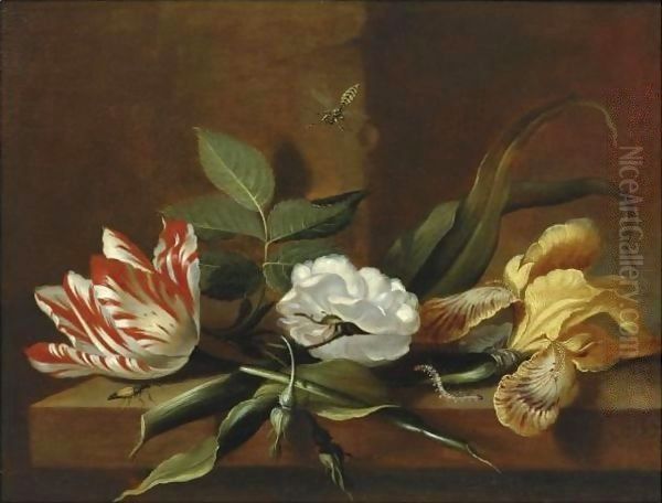 Still Life With A Yellow Iris, A Parrot Tulip, A White Rose And Insects On A Wooden Table Ledge