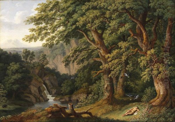 Waldlandschaft mit dem schlafenden, von Tauben behuteten Knaben Horaz