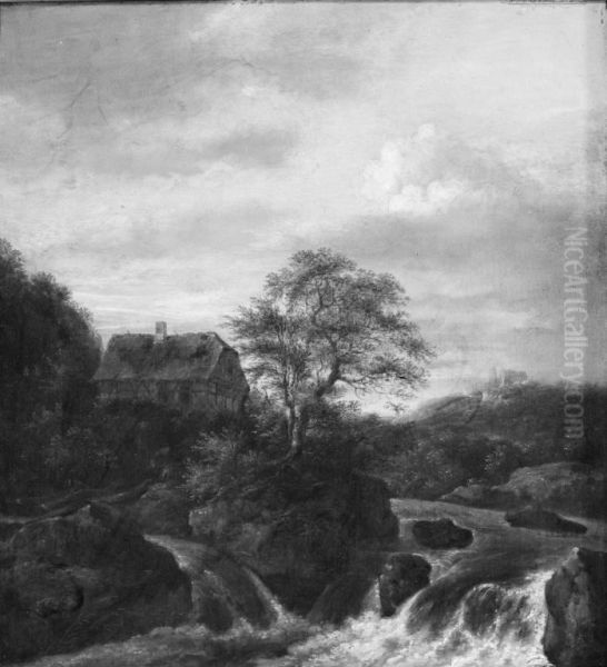 Jacob van Ruisdael’s A Waterfall in a Rocky Region (c. 1660s) immerses viewers in a dramatic Nordic landscape, where cascading water slices through rugged cliffs, mist swirling beneath towering trees. The scene balances raw power with poetic detail—foaming rapids contrast with serene pools, while gnarled oaks and delicate foliage frame the composition. As a prime example of Dutch Golden Age landscape painting, Ruisdael elevates nature’s untamed beauty through meticulous realism and atmospheric depth. His mastery of light—glimmers catching the waterfall’s spray, shadows pooling in rocky crevices—reveals his influence on Romanticism centuries later. This work exemplifies his signature blend of topographic precision and emotional grandeur, securing his legacy as one of Europe’s first "ecological" painters who revered wilderness as sublime.