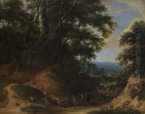 Hohlweg mit Soldaten, welche Bauern uberfallen