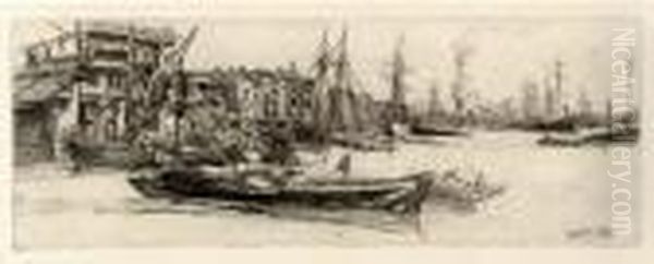 In Thames Warehouses, James Abbott McNeill Whistler masterfully captures the ethereal beauty of London’s industrial riverfront under twilight. Painted around 1860–70 during his pivotal Thames Set period, the work embodies his fascination with atmospheric nocturnes, blending realism with a poetic, almost abstract quality. The composition reveals shadowy warehouses lining the river, softened by mist and reflected in the water’s gentle ripples—Whistler’s signature tonal harmony uniting the scene in quiet solemnity. This piece exemplifies his revolutionary approach to capturing mood over detail, foreshadowing later Aesthetic Movement ideals where "art for art’s sake" reigned. Though initially controversial, such works cemented Whistler’s legacy as a bridge between Romanticism and modernism, influencing generations of artists exploring light and emotion.
