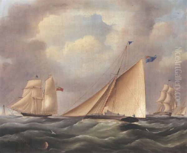 James Edward Buttersworth’s A Cutter And Other Shipping Near A Lighthouse captures the dramatic energy of maritime life in the mid-19th century. The painting depicts a fleet of sailing vessels battling choppy seas under brooding skies, guided by a steadfast lighthouse—a symbol of safety amidst nature’s tumult. Buttersworth, renowned for his marine art, masterfully balances realism with romanticism, infusing the scene with lifelike detail while evoking awe for the ocean’s power. His skillful rendering of light reflecting off waves and sails creates a dynamic composition, drawing viewers into the windswept moment. As part of the American Luminism tradition, the work exemplifies Buttersworth’s technical precision and atmospheric depth, cementing his legacy as one of the era’s foremost marine painters. Beyond its artistic merit, the piece offers historical insight into 19th-century seafaring, making it a prized subject for collectors and maritime enthusiasts alike.