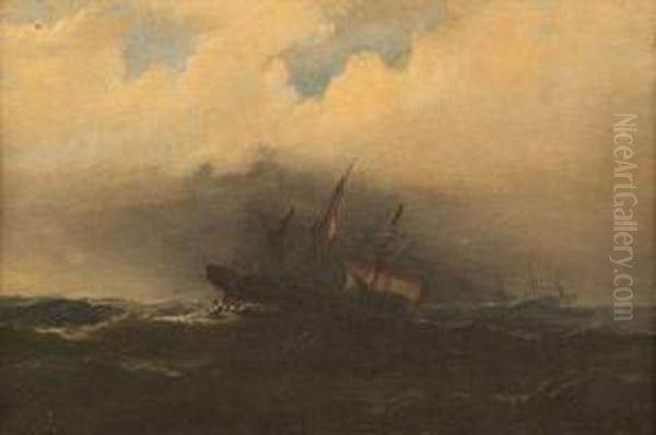 James Hamilton's Seascape With Ships is a captivating maritime masterpiece that immerses viewers in the grandeur and power of the ocean. Painted in the mid-19th century during America's Romantic period, the artwork showcases Hamilton's signature blend of realism and dramatic luminosity, influenced by the Hudson River School’s reverence for nature’s sublime forces. Dark, rolling waves dominate the composition, their frothy crests contrasting with brooding storm clouds, while ships—rendered with meticulous detail—struggle against the tempestuous sea. This scene evokes both awe and melancholy, reflecting the era’s fascination with humanity’s fragile relationship with nature. Hamilton, though less celebrated than peers like Frederic Church, earned recognition for his dynamic seascapes that bridged realism and emotional intensity. Seascape With Ships exemplifies his skill in balancing technical precision with atmospheric depth, securing its place as a noteworthy example of 19th-century American marine painting.
