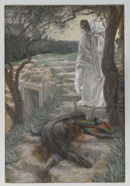 In James Jacques Joseph Tissot’s Touch Me Not (also known as Noli Me Tangere), the biblical encounter between Christ and Mary Magdalene is rendered with exquisite detail and emotional depth. Tissot, a French painter who later embraced spirituality, captures the moment of tender restraint as Christ, bathed in a divine glow, gently withdraws from Mary’s touch. The composition balances intimacy and mystery—Mary kneels in devotion amidst lush foliage, her rich red robe contrasting with Christ’s ethereal white garments. The background, a misty garden at dawn, enhances the sacred atmosphere. Executed during Tissot’s later phase of religious works, Touch Me Not reflects his precise academic training fused with symbolic realism, bridging the Pre-Raphaelite attention to detail and emerging modernist sensibilities. Though lesser-known than his fashionable society scenes, this piece exemplifies his mastery of narrative tension and spiritual themes, securing his place among 19th-century artists who reimagined biblical subjects with psychological nuance.