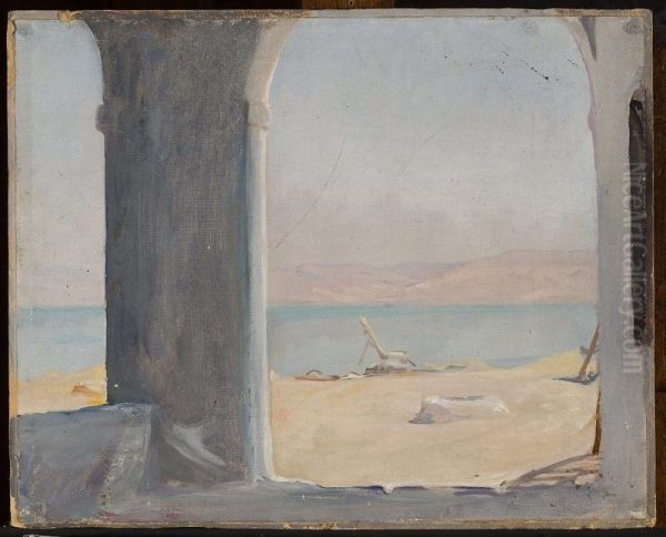Jan Ciaglinski's The Dead Sea. From the Journey to Palestine is a mesmerizing canvas that transports viewers to the serene yet otherworldly landscape of the Dead Sea. Painted with delicate brushwork and a luminous palette, the artwork captures the ethereal glow of sunlight dancing on the water’s hypersaline surface, framed by distant, hazy mountains. Ciaglinski, a Polish-Russian painter associated with the plein air and Impressionist movements, masterfully blends realism with atmospheric spontaneity, evoking the sublime tranquility of this biblical region. Created during his travels in the late 19th or early 20th century, the piece reflects European artists' fascination with the Near East’s exotic landscapes. While less widely known than his peers, Ciaglinski’s work holds significance for its bridge between academic precision and Impressionist light studies, offering a poetic yet precise portrayal of nature’s quiet grandeur.
