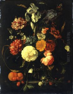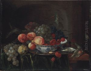 A Still Life With White And Blue Grapes, Peaches, Cherries, A Fig, An Ear Of Wheat, Oak Leaf And Acorns, A Sweet Chestnut, Filbert Nuts, Hawk-Weed, A Medlar, A Garden Tiger Moth, Together With Borage, And Other Flowers