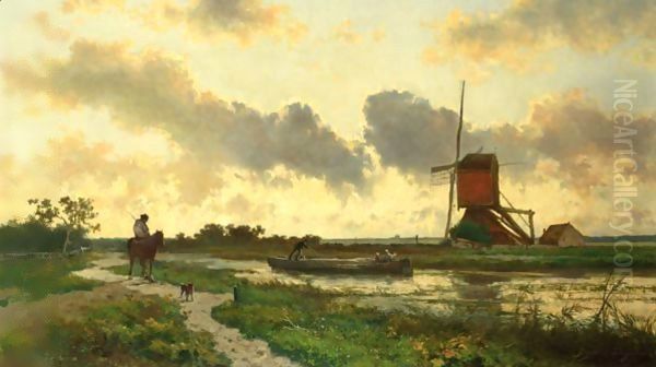 Jan Hendrik Weissenbruch’s Sunset Near Boskoop is a breathtaking example of the Dutch Hague School, capturing the serene beauty of the Dutch countryside. Painted in the late 19th century, the artwork immerses viewers in a tranquil sunset scene, with soft golden light filtering through the clouds and reflecting on the calm water. Weissenbruch, known for his mastery of light and atmospheric effects, employs loose brushstrokes to create a sense of movement and spontaneity, while maintaining harmony between land, water, and sky. The muted yet warm color palette—shades of ochre, lavender, and deep blue—evokes a nostalgic, almost poetic mood. As a prominent figure in the Hague School, Weissenbruch’s works are celebrated for their realistic yet emotive portrayal of nature, bridging the gap between Romanticism and early Impressionism. Sunset Near Boskoop remains a testament to his ability to elevate everyday landscapes into timeless contemplative masterpieces.