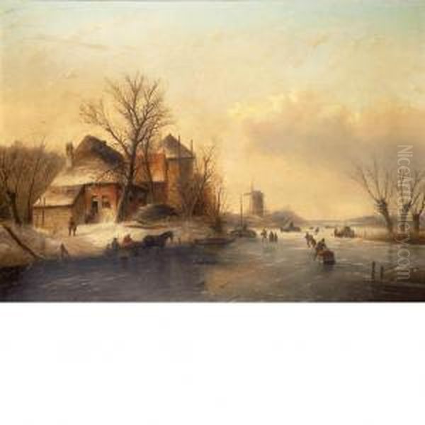Jan Jacob Coenraad Spohler’s Winter Landscape captures the serene yet lively essence of a 19th-century Dutch winter. The painting portrays a frozen canal bustling with skaters, surrounded by quaint houses dusted with snow and delicate trees glistening under a soft, overcast sky. Spohler’s meticulous brushwork and keen attention to atmospheric detail reflect the Romantic influence in Dutch painting, blending realism with an almost poetic nostalgia for rural life. Active yet harmonious, the scene evokes both the joy of winter pastimes and the quiet beauty of the season. As part of the Hague School tradition, Spohler’s work embodies the Dutch Golden Age’s legacy while adapting to 19th-century tastes, making it a cherished example of winter genre scenes in European art history.