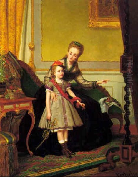 Step into The Disguise by Jan Frederik Pieter Portielje (1829–1908), and you’re greeted with an intimate, playful vignette of 19th-century bourgeois life. The Dutch artist, renowned for his meticulous genre scenes, captures a moment of lighthearted deception—often depicting elegantly dressed women engaging in flirtatious or coy interactions. Portielje’s precise brushwork and warm, subdued palette reflect the influence of the Romantic and Realist traditions, bridging historical charm with keen social observation. Though not as widely celebrated as his contemporaries like Alma-Tadema, his works remain prized for their narrative richness and finely rendered textures, offering a glimpse into the nuanced theatrics of daily life during Europe’s genteel era.