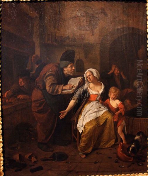Jan Steen's An Alchemist and his Family (c. 1660) is a captivating genre painting that blends humor, chaos, and moral undertones. The scene depicts an alchemist's cluttered workshop, where the disheveled family struggles amid scattered tools, overturned furniture, and a distracted wife playing with a parrot—a satirical jab at alchemy's false promises. Warm, earthy tones and subtle light filtering through a window create an intimate yet chaotic atmosphere, typical of Steen's theatrical compositions where domestic disorder symbolizes human folly. As a master of Dutch Golden Age painting, Steen used this work to critique social pretensions while showcasing his skill in narrative detail and expressive figures. The painting stands as an important example of merry company scenes, reflecting 17th-century Dutch society's fascination with moralizing domestic narratives through vibrant realism.