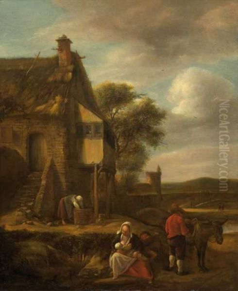 Jan Steen's Landscape with Figures before a House is a delightful glimpse into 17th-century Dutch genre painting, radiating warmth and rustic charm. Created around 1660–1670, this oil on panel showcases Steen's signature blend of lively narrative and meticulous detail, capturing villagers engaged in leisurely activities outside a thatched-roof cottage. Sunlight filters through the foliage, casting dappled shadows that animate the scene—a hallmark of Golden Age landscapes. Steen elevates everyday life into art, infusing his works with humor and subtle moral undertones, reflecting the Dutch emphasis on realism and humanism. Though less overtly chaotic than his famous tavern scenes, this piece exemplifies his mastery of composition and storytelling. As both a painter and innkeeper, Steen had unparalleled insight into communal dynamics, making his works invaluable records of social history. Today, such paintings anchor museum collections as prime examples of how Dutch art transformed mundane moments into enduring cultural treasures.