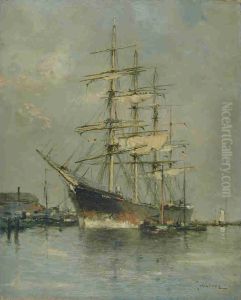 Dutch Sailing Barge By A Town, Signed 'j V D Linde'