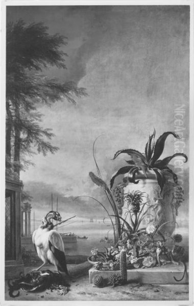 Jan Weenix’s Stillleben mit exotischen Pflanzen, Konigsgeier, Papagei und Affe (Still Life with Exotic Plants, King Vulture, Parrot, and Monkey) is a masterful display of 17th-century Dutch baroque still-life painting, rich in luxurious detail and exotic allure. The composition bursts with vibrant textures—feathers, fur, and lush foliage—creating a sense of opulence and curiosity. Against a darkened backdrop, the meticulously rendered animals and plants seem almost alive, embodying the Dutch Golden Age’s fascination with global trade and natural history. Weenix, celebrated for his hunting trophies and sumptuous still lifes, elevates this work beyond mere decoration; it serves as both a status symbol and a scientific record of rare species brought to Europe through colonial expansion. Its hyperrealistic precision places it among the finest examples of Dutch vanitas and pronkstilleven (ostentatious still life), inviting contemplation on themes of mortality, wealth, and human dominance over nature.