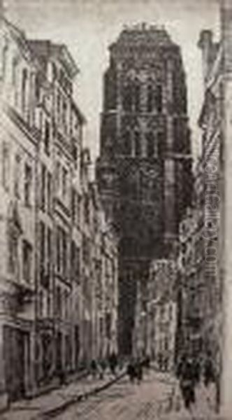 The painting Wieża Kościoła Mariackiego w Gdańsku by Jan Wojnarski captures the grandeur of St. Mary's Church tower in Gdańsk with remarkable atmospheric depth. Rendered in Wojnarski's signature style blending realism with subtle expressionistic touches, the artwork depicts the Gothic spire bathed in soft, diffused light, likely suggesting either dawn or dusk. Wojnarski (1879–1937), an important figure in Polish graphic arts and painting, was known for his architectural landscapes that documented Poland's cultural heritage during the early 20th century. This particular work stands as a significant example of interwar Polish cityscape painting, showcasing both precision in architectural detailing and poetic sensitivity to light effects. The vertical composition emphasizes the tower's soaring height, while muted earthy tones contrasted with luminous sky creates a contemplative mood, reflecting Wojnarski's mastery in balancing documentary accuracy with artistic interpretation.